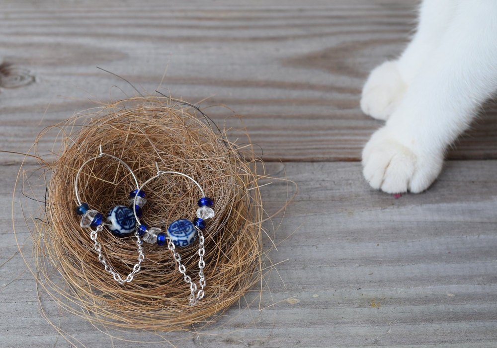 Made especially for you these darlings are made of blue Chinese pottery bead, crystal hunks, and decorative draping chain on a sterling silver hoop. Comes gift wrapped, without price tag.