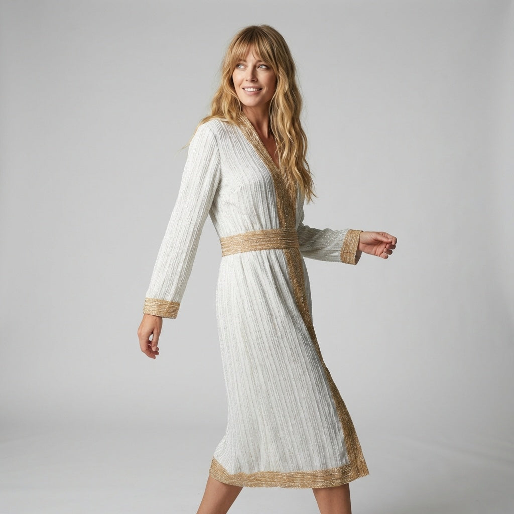 This is a stunning 1960s '70s era silver white and gold metallic Goddess party dress The fabric on this dress is gorgeous. It is a type of metallic lamé or tinsel fabric with a pleated or ribbed texture and a bit of stretch. The base color is white and the tinsel is silver throughout. This is made of polyester with stretchy feel to fabric and talon back zipper. The base accents along the neck, front waist, and hem lines are in gold fabric with silver tinsel. Best fit 6/8 or medium.
