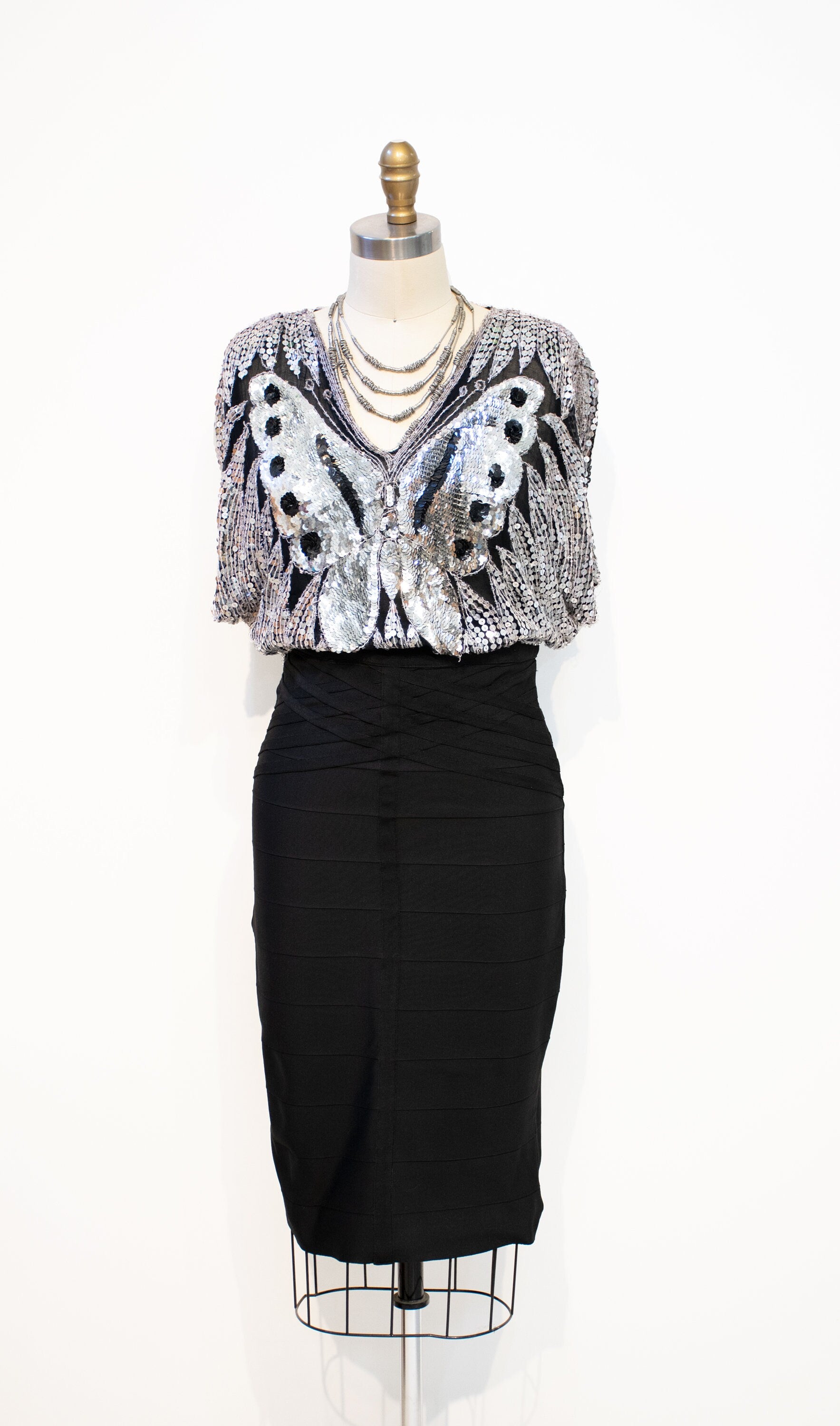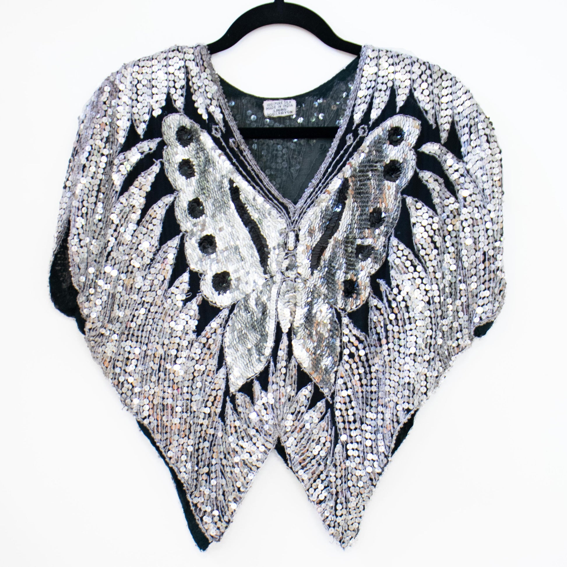 Chest - up to 44 Length - 19-23 Silver and black beads/sequins in a butterfly design Lightly padded shoulders Slouchy fit Asymmetrical hemline Silk base/lining Label/Designer: made in India Fabric: Silk sequins rayon Color:Black/ silver Size Marked: - free size from small to large Handwash inside out and air dry to keep all the beads in good shape.