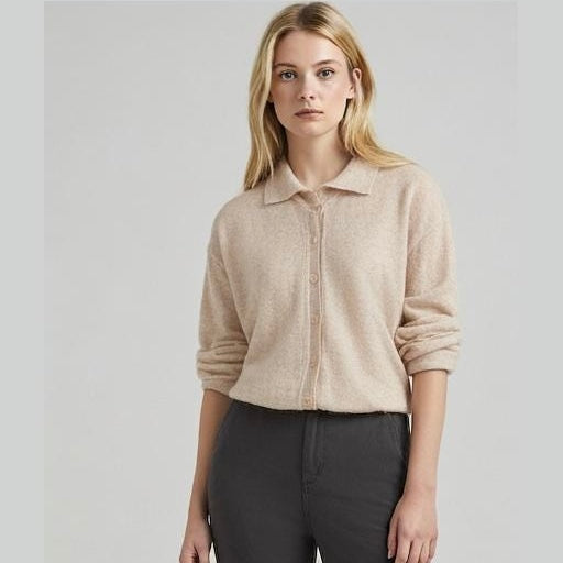 Cozy up in this timeless vintage beige Irish soft wool cardigan sweater. Featuring a classic button-up front and a stylish collar, this soft knit top is perfect for layering. Its versatile neutral tone makes it a wardrobe essential for any season. A must-have piece for lovers of retro fashion and comfortable style.