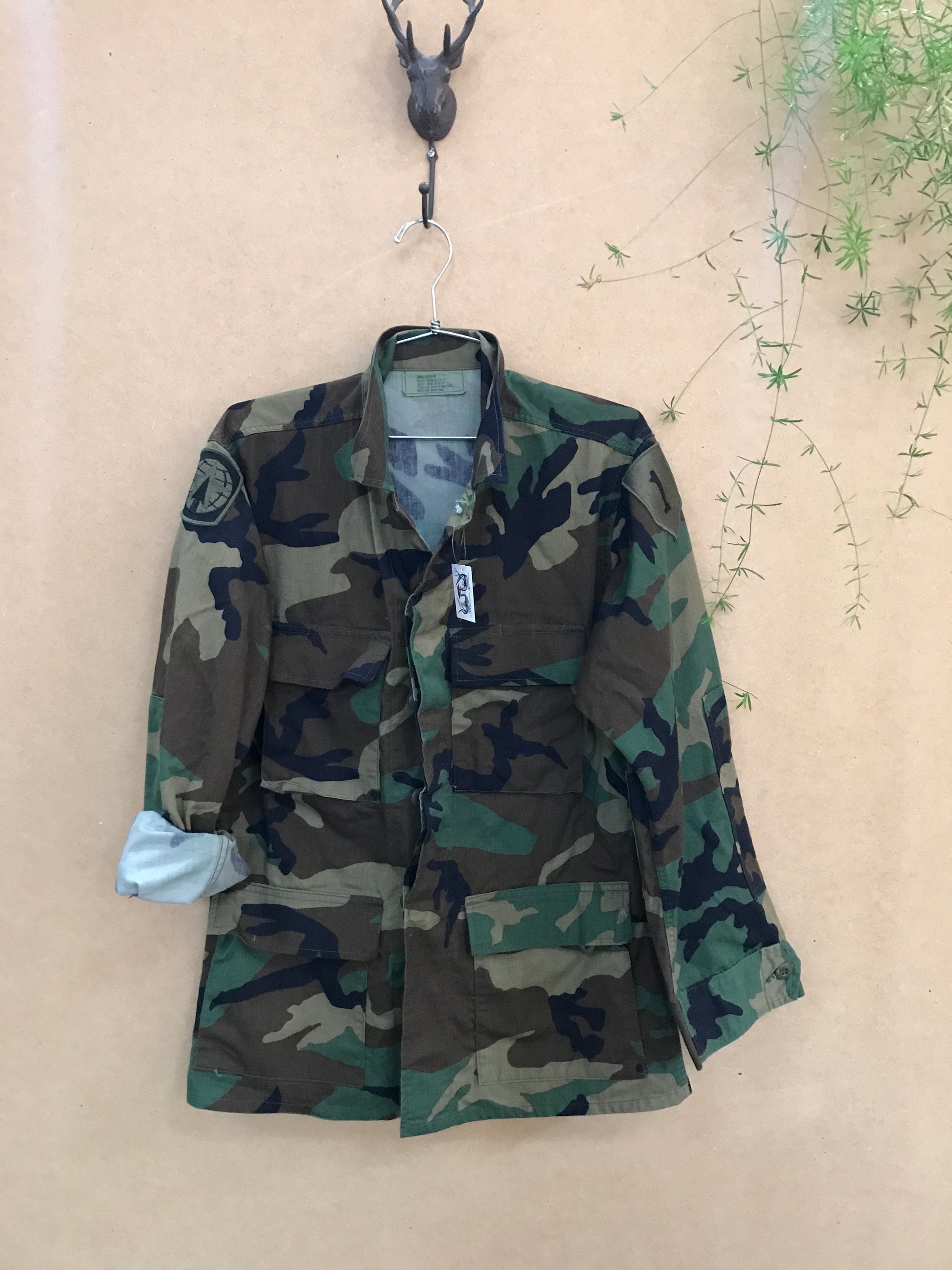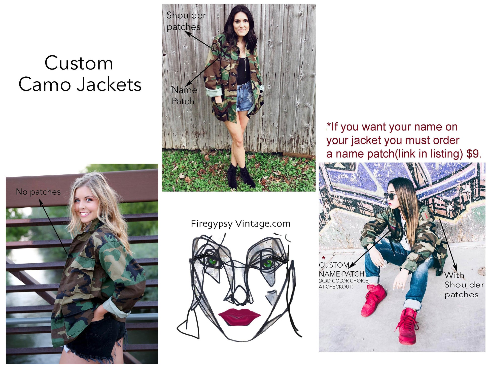 Vintage Army Camo jacket. Reclaimed military jacket. With button down front, dual buttons at the sleeves can adjust the fit. With a slouchy-silhouette and you can choose with or without patches. Cool girl, tomboy comfortable style. 4 large exposed front button pockets, washed cotton. If you order "with patches," this will only include the shoulder patches. If you want your name embroidered on the front you will need to add the "link below" to your order and choose the color you prefer ADD A CUSTOM-NAME PATCH HERE