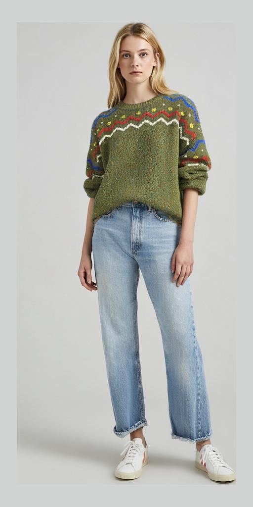 Cozy up in this vintage green knit sweater, featuring a bold geometric zigzag pattern with red, white, blue, and yellow accents. Perfect for a retro or casual look. Crafted for warmth and style, this pullover is a must-have for any vintage clothing enthusiast. Excellent condition, ready for its next adventure.
