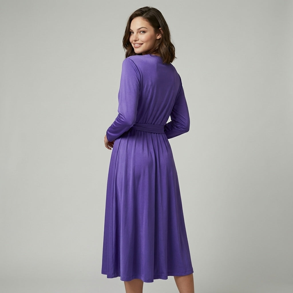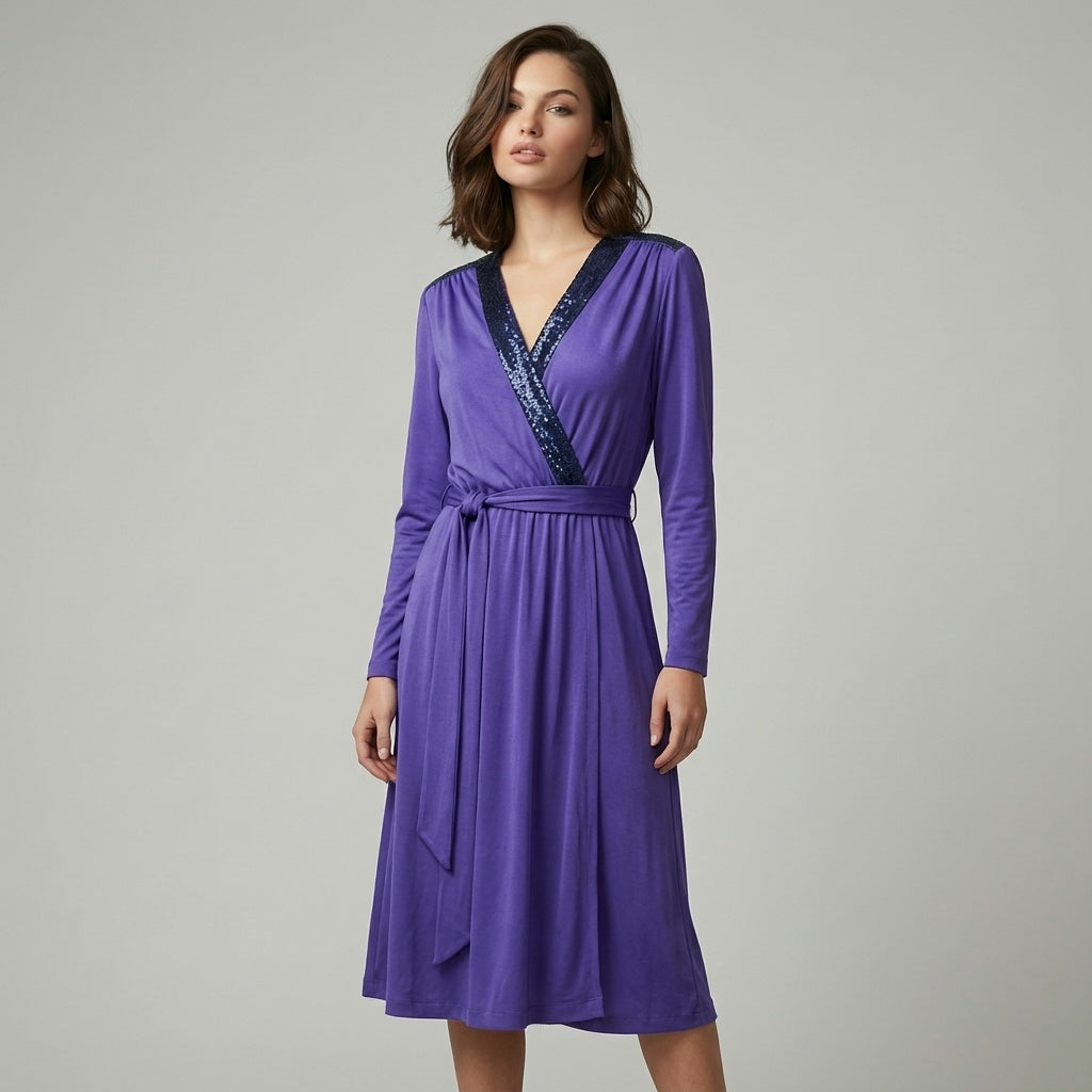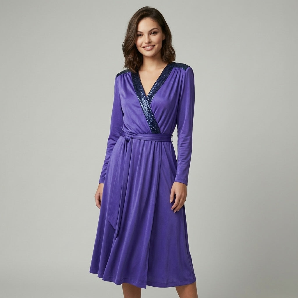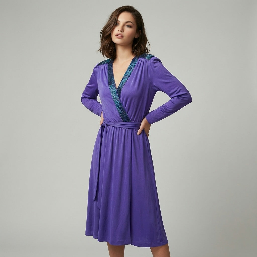 Stunning 1970s 80s Disco Glam party dress. This is an adjustable size due to the wrap dress styling. long tie waist. Beautiful wide panel of glass tube beads decorate the plunging V and the tops of the shoulders. Beautiful purple color and the beads are blue purple with subtle metallic coloring. Step out in style with this stunning vintage purple wrap dress. Featuring a flattering V-neckline adorned with intricate black beading and long sleeves, this midi dress is perfect for any occasion. The tie waist ensures a custom fit, highlighting your silhouette. A timeless piece that blends classic elegance with a touch of retro glamour.