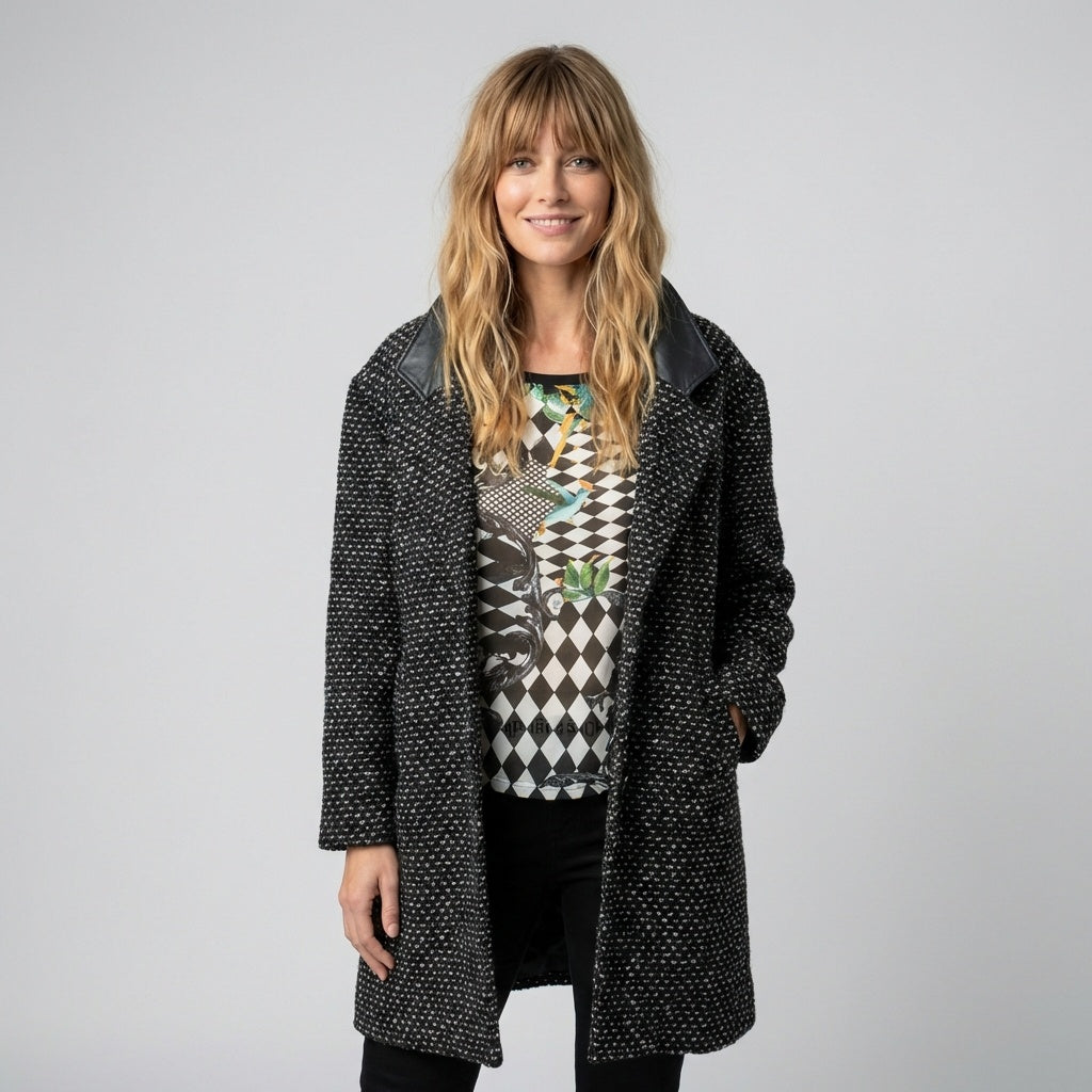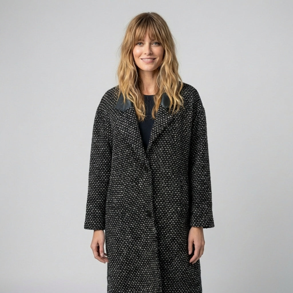 Vintage Tweed Wool Coat Leather Collar Winter Jacket Size Medium